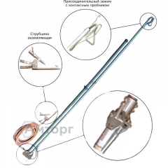 Устройство УПН-10Б состоит из наброса, имеющего активную (рабочую) часть, заземляющей части со струбциной, изолирующего канатика с грузиком и заземлителя ЭЗ-1.